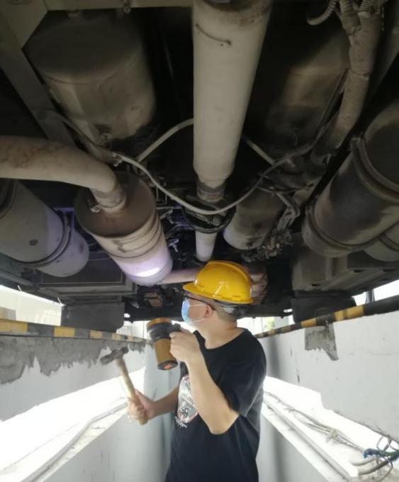 一把榔頭只為堅守源頭安全。在車站車輛例檢處,例檢員劉海正在烈日下作業(yè),滾燙的水泥地面、發(fā)熱的客車底盤和客車尾氣讓車輛例檢臺溫度更高。劉海不停地在車輛底部鉆進鉆出,從燈光、轉向、制動、底盤,到車胎、螺絲、安全帶、消防錘等,認真檢查著每一個車輛部件。客車底部的高溫讓他下去一次便全身濕透一次,臉上的汗也順著頭發(fā)往下滴落。說起自己的工作,劉海認為雖然工作環(huán)境惡劣一些,但是與售票員、檢票員并沒有什么不一樣,只是分工不同,做好車輛例檢工作,保障客車運行安全,是我們的責任,目的都是為旅客出行服務。